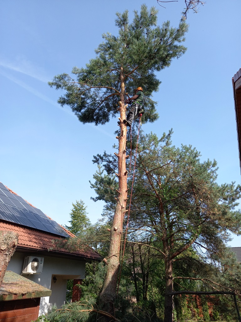 Arborystyczna i sekcyjna wycinka drzew w trudnych warunkach. Praca alpinistyczna w terenie zabudowanym z zachowaniem najwyższych standardów bezpieczeństwa.